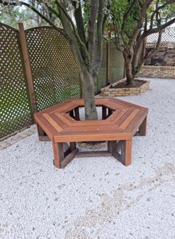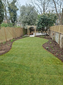 Solution::  A brick and rustic paving design for the side return and courtyard with a bespoke central pergola looking out over a lawn surrounded by curvaceous borders. New French style trellis replaced the fencing throughout. I set an arbor to enclose the lawn to provide an invitation into the secluded rear of the garden. Leaving the trees at the rear for privacy but to enhance them I designed a circular bench around one tree and imposed raised beds around the whole area to further augment the cloistered feel.